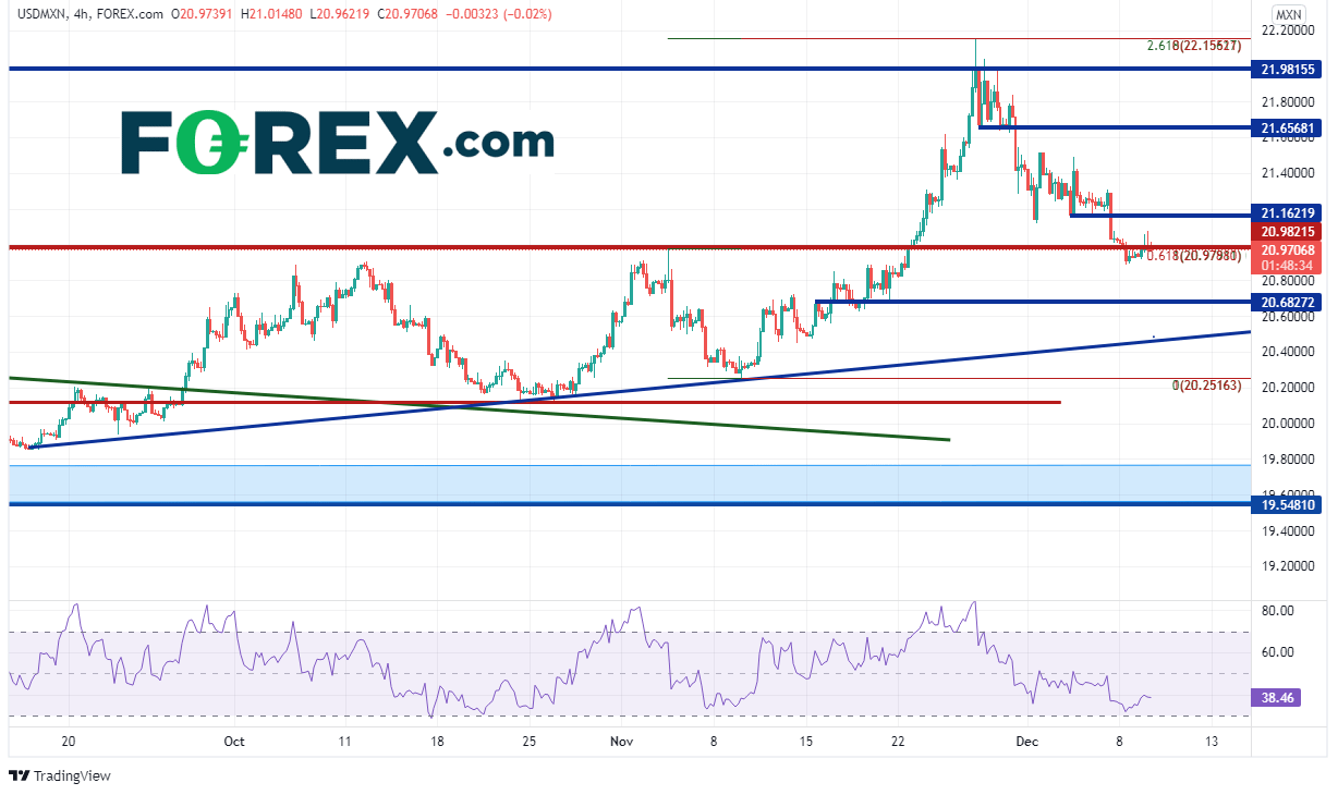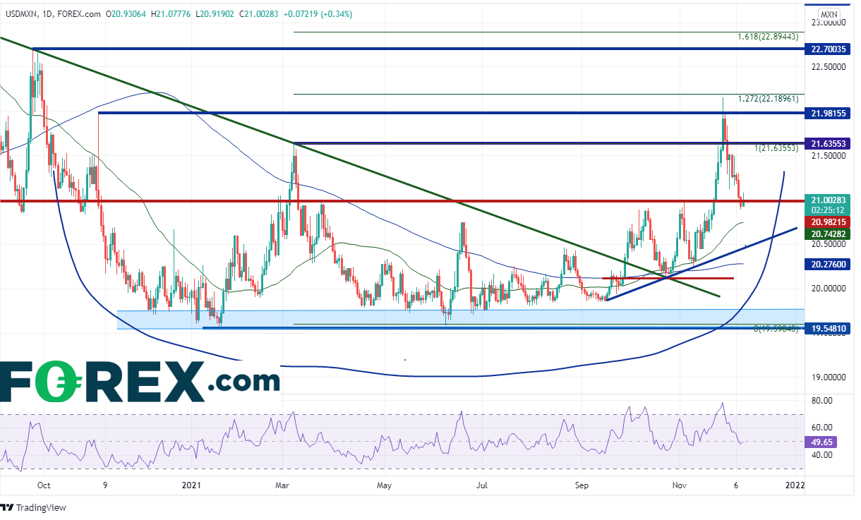 美元/墨西哥比索过去一年似乎一直处于一个筑底形态中,始终守住19.5491和19.7464支撑区域。该支撑区域多次遭到考验,但每次都经受住了考验。该货币对于9月28日站上2020年6月以来的下降趋势线所在的20.30附近,此后再没跌破该位。11月26日,价格摸至2021年3月高点到2021年6月低点的127.2%扩展位,即22.18附近,RSI进入超买区域,价格涨势也随之止步。上破22.00的水平阻力位也属“虚晃一枪”,此后价格回落至21.00的强水平支撑位。