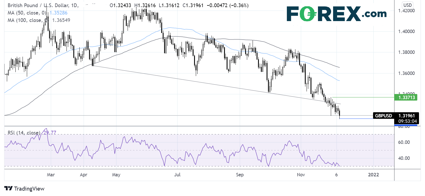 英镑/美元已下穿1.3194,失守数月下降趋势线支撑后触及年内新低。RSI仍未超卖,支持进一步下挫。