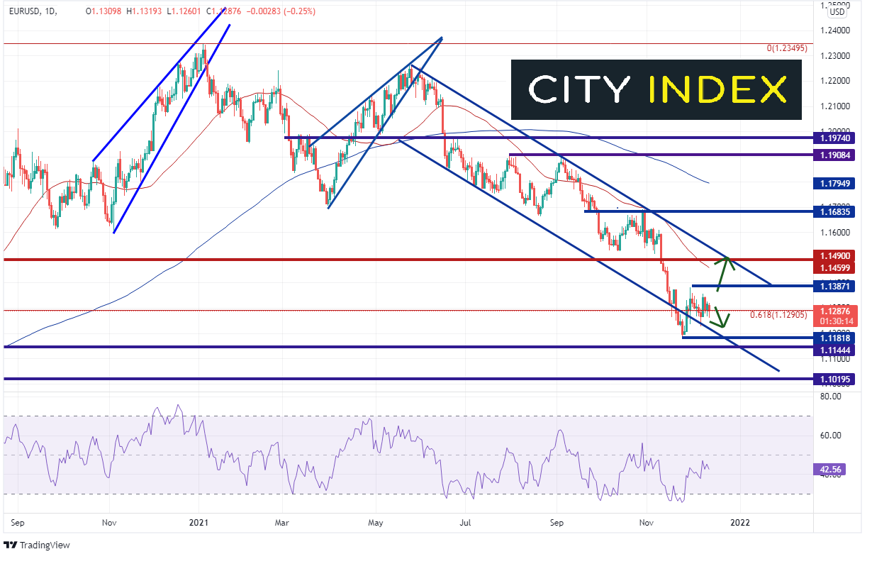 美国联邦公开市场委员会(FOMC)本周也将召开议息会议。交易员们可能还记得,鲍威尔几周前在参议院和银行业委员会作证时表示不能再用“暂时性”这个词了。市场立即为鲍威尔贴上鹰派标签!事实上,他似乎是少数几个公开承认通胀将持续一段时间的美联储成员之一!11月CPI同比涨幅为6.8%,创1982年以来最高水平!预期本周FOMC委员将投票决定加速150亿美元/月购债步伐。问题仍在于提速幅度。如果幅度太小,美元可能走低。如果过大,美元或应声飙涨。重点关注鲍威尔新闻发布会对奥密克戎变种和通胀预期的进一步看法。