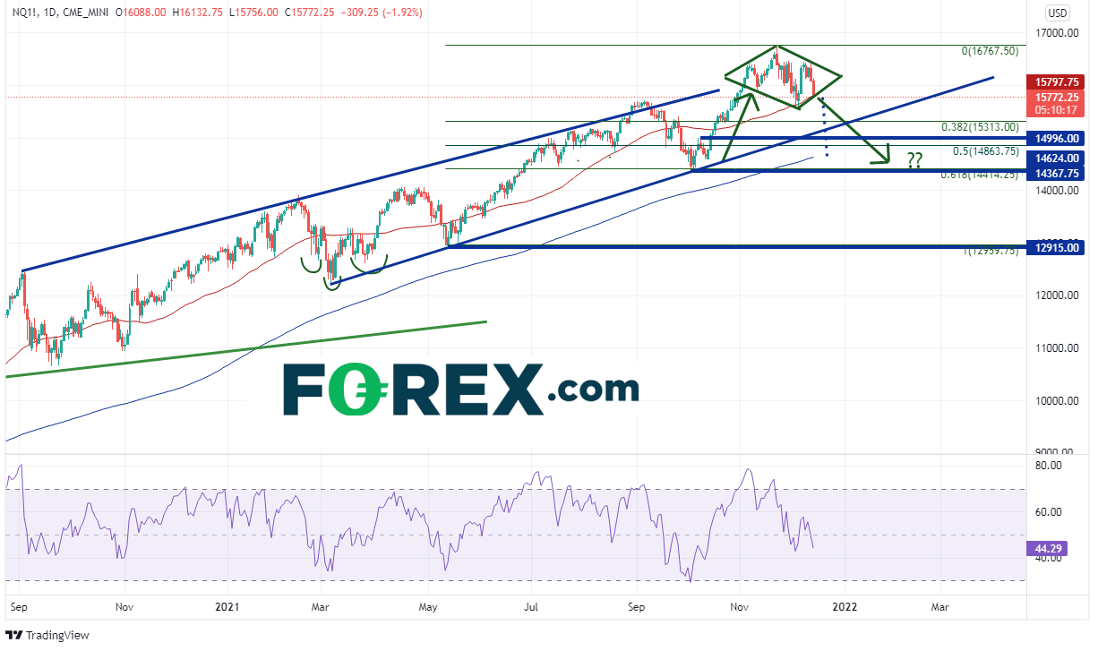 在近期反击历史高点失败后,纳斯达克100指数带头下跌。这个科技股密集的股指于11月22日创下历史高点,之后回撤至50天均线所在的15800附近,接着回升并试图创下历史新高,但不敌空头。空头在16413附近发起攻击,带动股指下跌的途中引发多个止损。