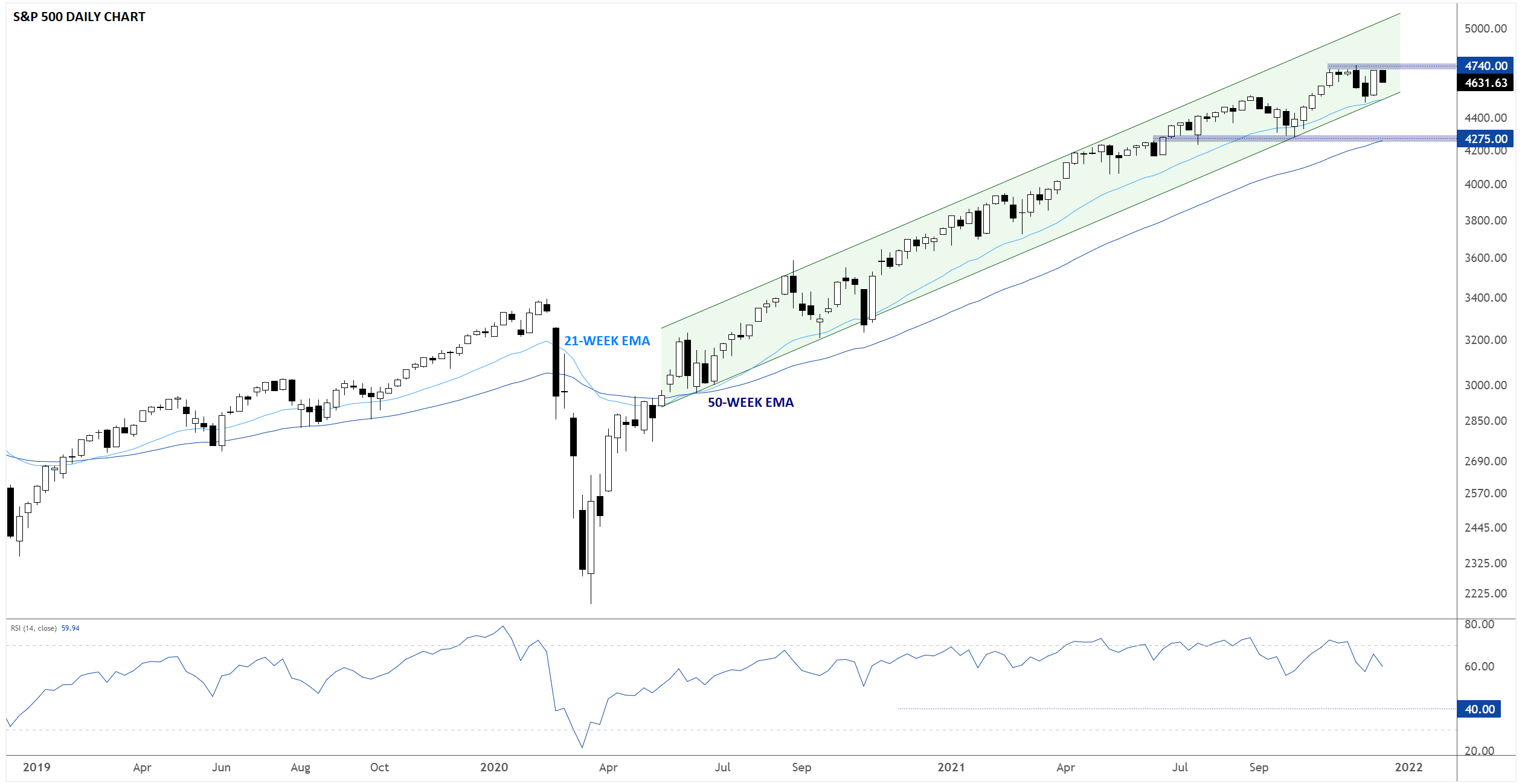 在日历即将翻到2022年之际,涵盖范围更大的标普500指数的上涨趋势相比道指更加清晰牢固。标普500指数在过去18个月明确形成了上涨通道,通道的支撑位在4500附近,那里汇集了通道下轨与21周指数移动均线。