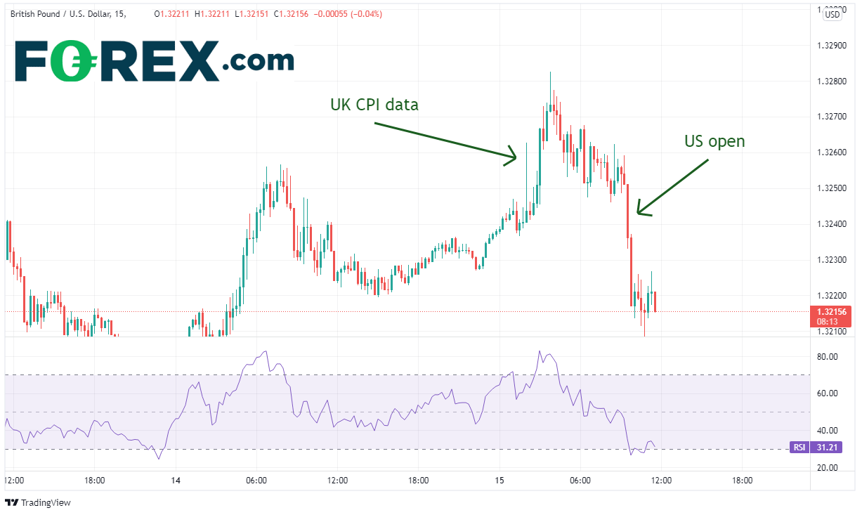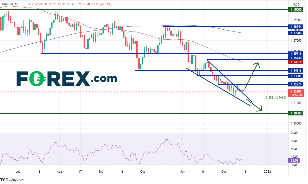 英国CPI数据高于预期,一开始推高英镑/美元。正如我的同事Fiona Cincotta在早些时候的文章中所指出的,表面CPI上涨5.1%,预期值4.7%,前值4.2%;核心CPI为4.0%,预期值3.7%,前值3.4%。而随着Omicron变异病毒威力强于预期的担心升温(就在此文发布前不久,英国报告日新增新冠病例数达到史无前例的78610例),英镑/美元开始走低。另外,美国股市因为FOMC立场偏强硬的预期而低开,拖累英镑/美元随之走弱。