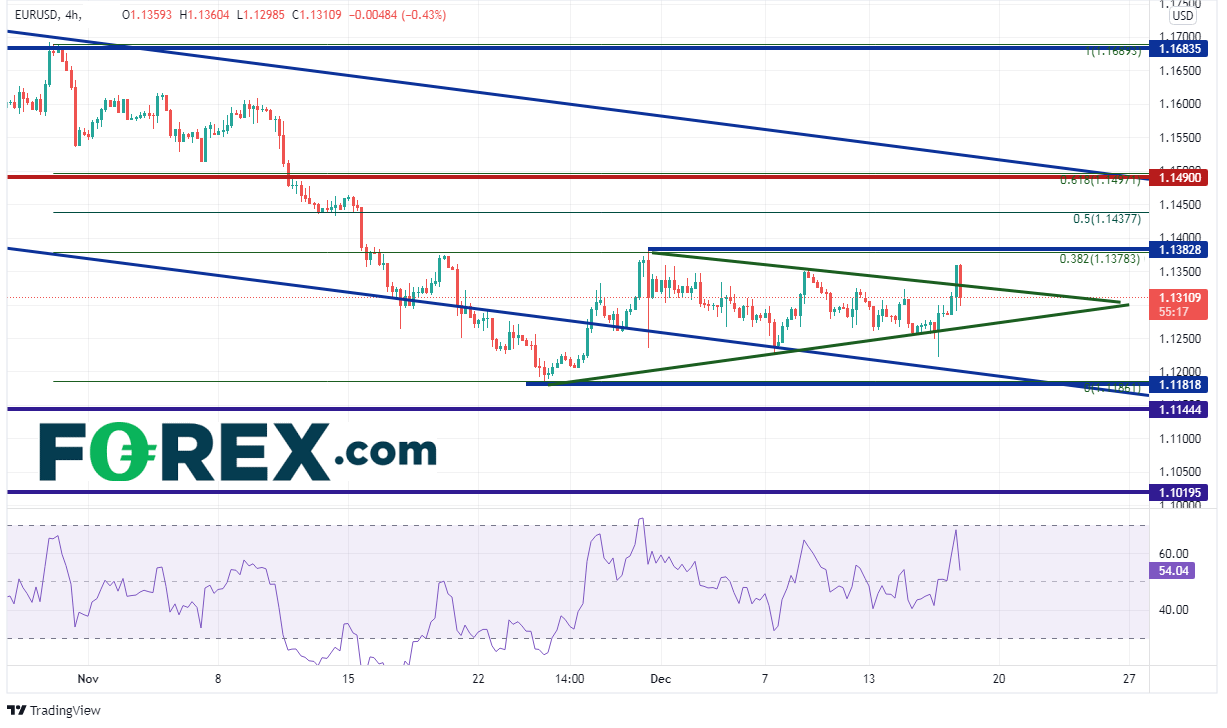 在通道上轨趋势线目标之下还有多个重要阻力位需要攻克,比如1.1380附近,那是10月28日高点到11月24日低点行情的38.2%回档位,也是水平阻力位所在。还有上方的1.1438,那是前述行情的50%回档位,也是50天均线所在。下档第一个支撑在短期三角形下轨趋势线所在的1.1262附近,然后为周三低点1.1222。如果下破之,可能跌至11月24日低点1.1144、长期水平支撑位1.1020。