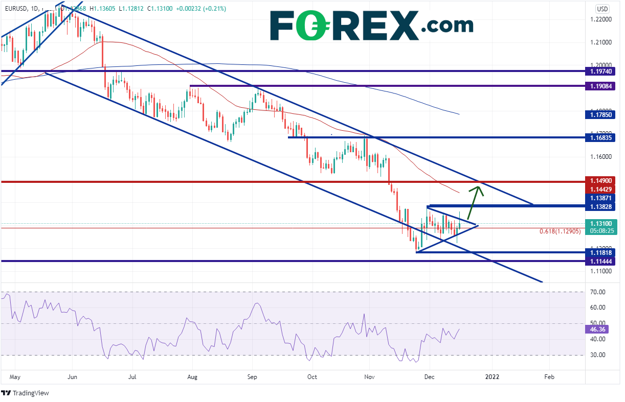 5月26日以来欧元/美元一直交投于长期下降通道内,11月26日止步于最新低点1.1186。欧元/美元之后回到区间内,目前徘徊于一个对称三角形内。价格突破通道一边失败后往往走向通道的另一边。欧元/美元之前下破通道失败,所以后市可能上攻下降通道的上轨趋势线,即1.1490附近。