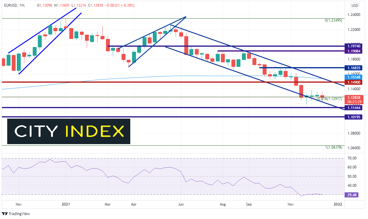 在负利率和大规模宽松计划背景下,美元/日元对日央行决定反应冷淡,相反,该货币对与10年期美债收益率相关性更为密切。周线图相关系数为+0.80。系数高于+0.80,则视为两种资产之间存在很强的相关性。因此,若美债收益率上升,美元/日元也应走高。2021年初,美元/日元升穿2020年2月122.12高点以来下降楔形103.55附近。货币对此后回撤楔形高度并最终站上前高点上方。在此过程中,美元/日元测试115.52阻力位,并回落至112.12旗形支撑位。若汇价继续走高,旗形目标为旗杆高度+突破点,即118.0附近。但货币对首先必须拿下114.00附近顶部趋势线阻力及近期高点115.52。112.12附近前高点阻力位及2021年9月低点至2021年11月高点上行之50%回档现充当首个支撑。同时期走势之61.8%回档落在略下方的111.56,然后是2021年4月以来上斜趋势线110.00附近。