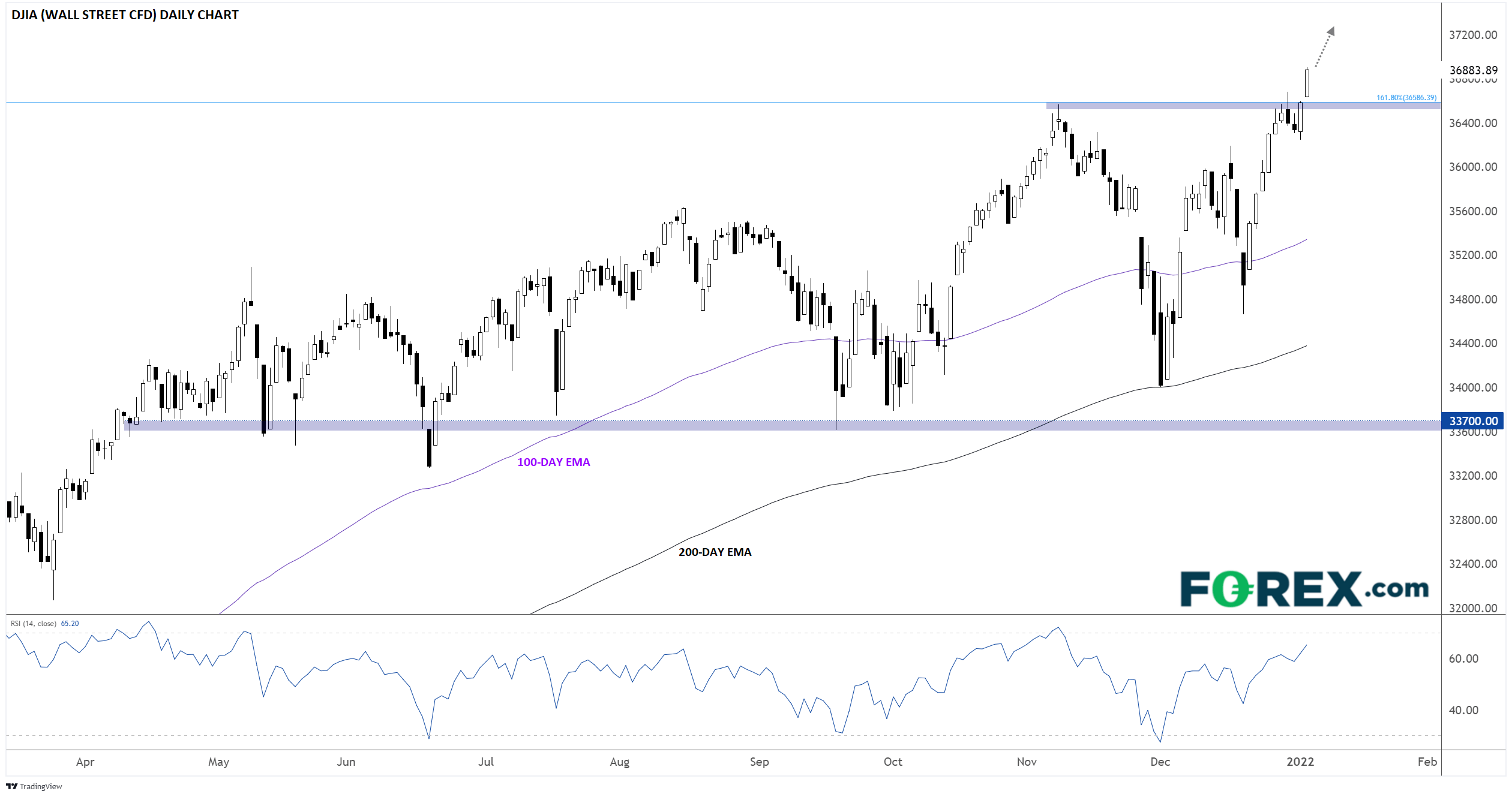 如果换用更为传统的技术分析术语,我们可以说今天的反弹促使这个最受关注的美国股指大举突破至历史高点。如下图所示,道指(华尔街差价合约)业已站上36600区域的前高点,该区域也是2020年一季度以来疫情造成的崩盘行情的161.8%扩展位: