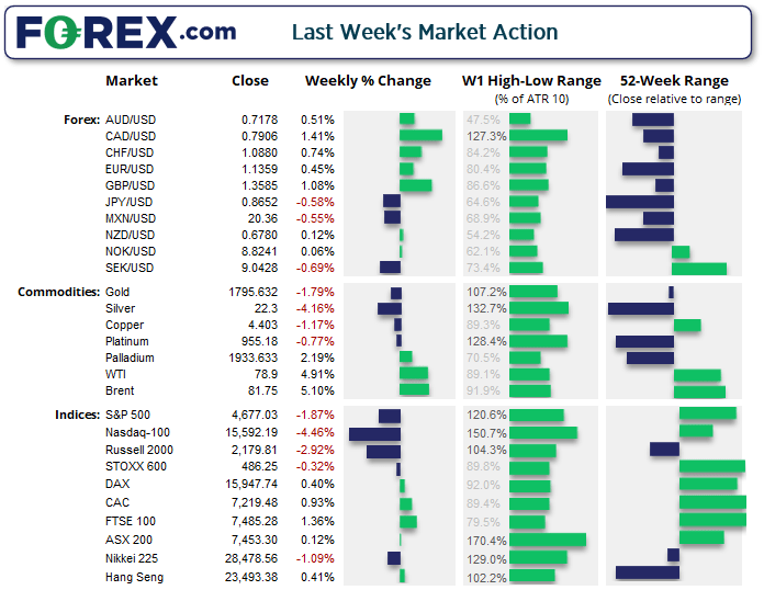 上周美股显著收低,其中科技股跌幅达到4.5%左右,创下10月底以来最大单周跌幅。立场强硬的美联储携手美国提前加息的预期,重创股市投资者信心,导致标普500指数和纳斯达克100指数形成看跌吞噬K线。但短线技术面仍具备抛压减弱的希望。上周标普500指数仅下跌0.4%,目前正试图守住月图枢轴点,而纳斯达克100指数的下跌止步于12月低点上方不远处。