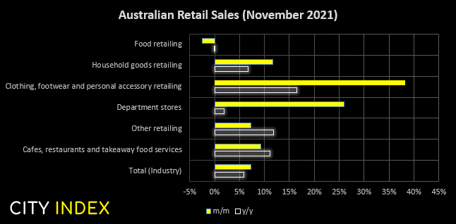 澳大利亚消费者11月继续恪尽职守,带动零售销售数据增长7.3%,增幅高于10月的3.9%,也超过预期的3.5%,创下疫情后最大月度增幅,和上年同期比较增长了5.8%。