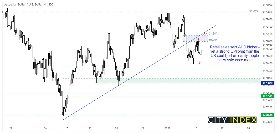 截至本文撰写时,澳元/美元上涨了约0.5%,但仍保持0.72关口之下。尽管零售销售为货币对提供更大动能,但我们仍然怀疑,若明天美国CPI强劲增长,澳元/美元能否进一步冲高。强劲通胀数据很可能预示着美联储将从3月开始启动4次加息,从而抵消今天零售数据数据带来的正向走势。当然,如果美国CPI令人失望(可能性很低),那么我们就有理由短线看涨澳元/美元。
