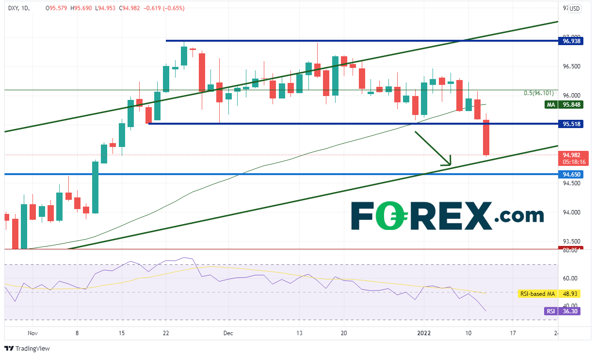 美国12月CPI报在7%,符合预期。交易者趁机了结部分美元多头头寸。正如早些时候发布的《CPI数据简单回顾》文章所说,美元指数2021年11月中旬以来一直在95.50 - 97.00区间横盘整理。美元指数在CPI数据发布后即急跌,目前考验2021年5月以来长期上升通道的下轨趋势线。请关注是否可以守住94.90。(关于美元指数的支撑和阻力,请看《CPI数据简单回顾》)
