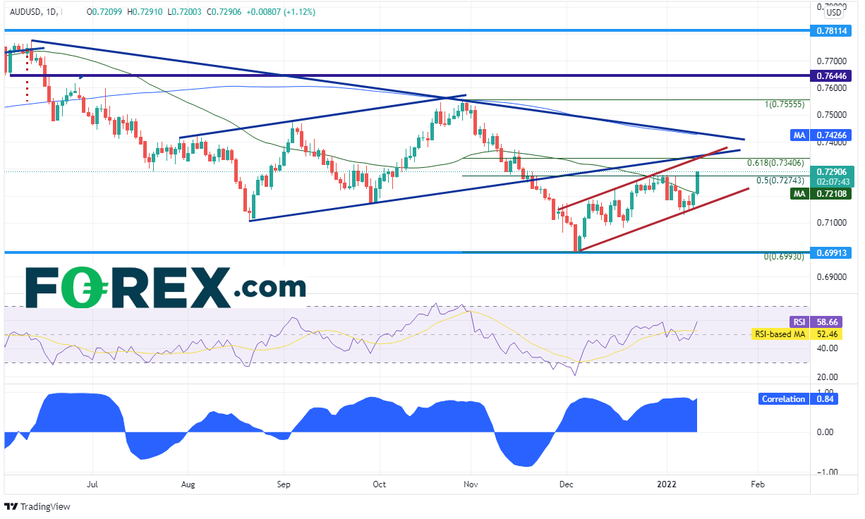 澳元/美元与黄金之间高度正相关,两者相关系数目前为+0.84。读数高于+0.80被视为相关性高。所以,如果黄金继续上涨,澳元/美元应可随之走高。该货币对一直交投于2021年10月28日高点到2021年12月3日低点行情的61.8%回档位上方,即0.7274附近。上方阻力在0.7340附近,由以下价位构成: