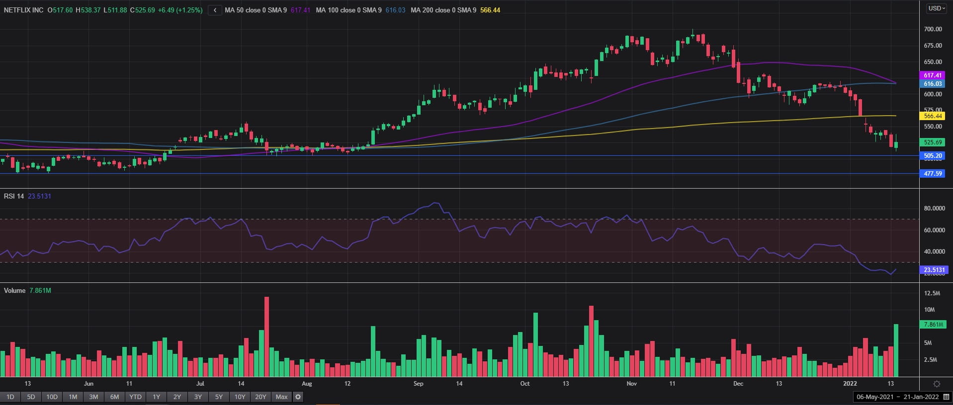 在2022年第一个交易周,奈飞股价跳空低开,并带动RSI进入超卖区域。股价可能很快开始反弹的观点有据可依,但在沿着200天平均线继续上攻566美元的跳空缺口之前,可能先滑落至505美元,这是去年7月和8月的关键支撑位。