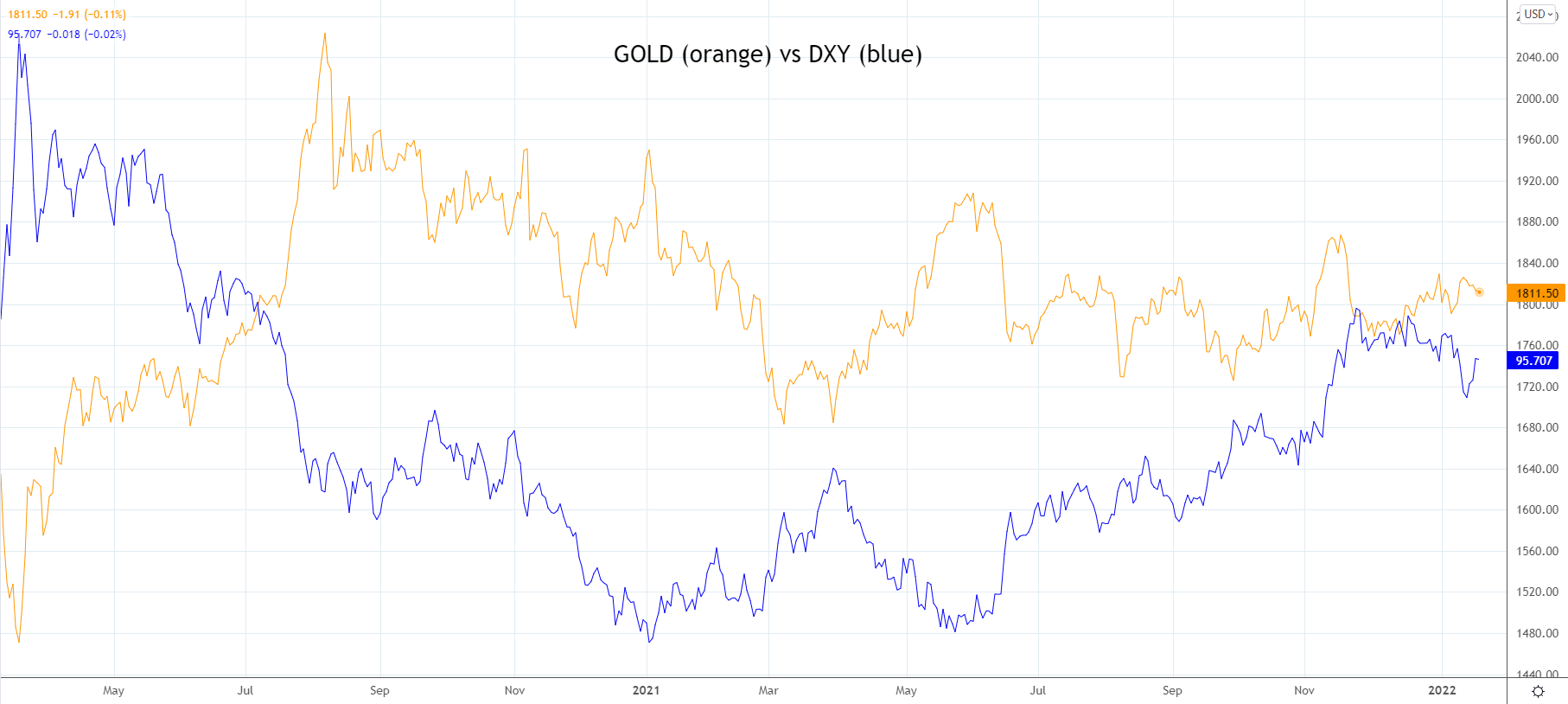 美元在2022年年初的下跌可能为与之形成负相关联系的黄金提供了支撑力量。但美元指数现已反弹至年初水平咫尺之遥的地方,对黄金的支撑力量正在减弱。