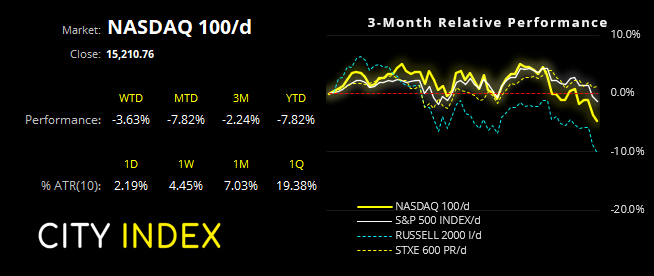 纳指过去几个月价格走势起伏不定,不过随着美债收益率在美联储加息预期前上升,看跌动量日渐攀升。股指会自此加速走低吗?很有可能。但市场很少直涨直跌,熊市/深度修正在反趋势震荡行情中非常常见。