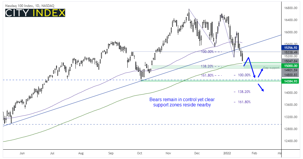 日线图来看,现在纳斯达克100指数看跌动量正在加速。但有如下三个非常突出的支持区: