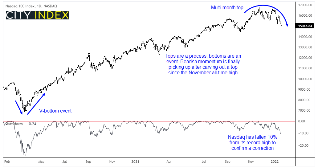 股市中有这样一种说法:“顶部是一个过程,而底部是一个事件”。这是因为市场攻顶之路可能缓慢而痛苦,而筑底则可能非常迅速。虽然并非总是如此,但现在的美国市场可能也出现了这种情形。比较纳斯达克100指数2020年3月的V型底部低点与其自创纪录高点以来的价格走势,你就知道我们为什么这么说了。