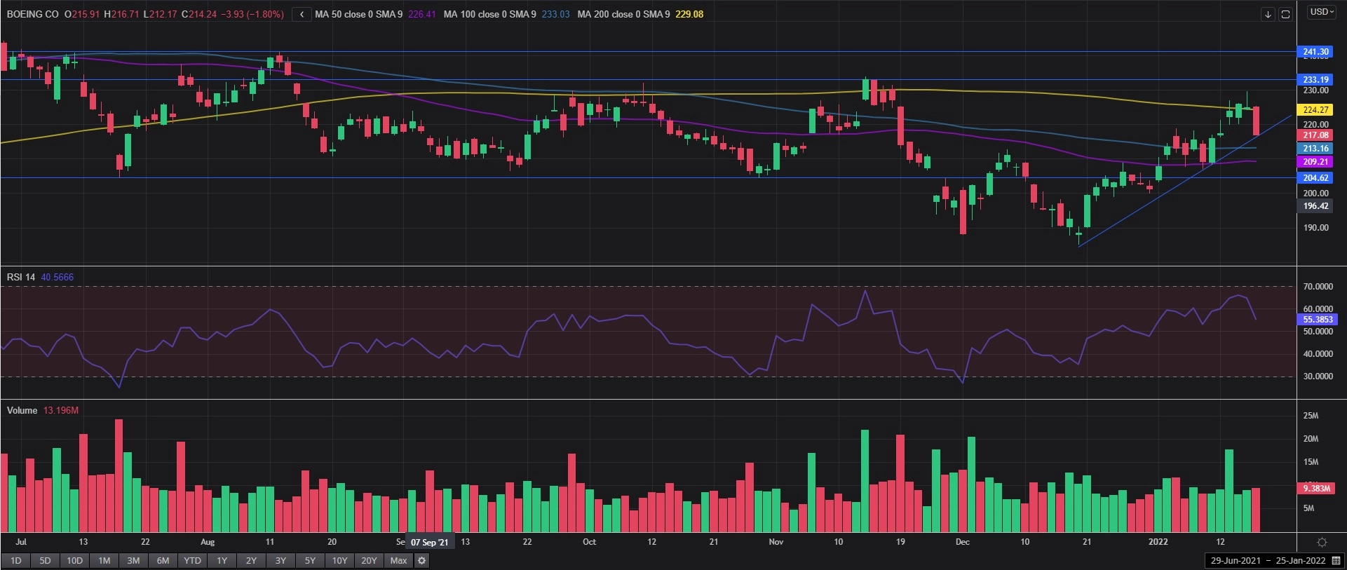 在从上个月创下的13个月低点185反弹之后的过去四周里,波音股价持续向上,最近测试了200天简单移动均线,目前交投于224。波音价昨天下挫3.5%,迅速填补了上周跳空高开形成的缺口,而且收盘价依然高于最近几周出现的支撑线。