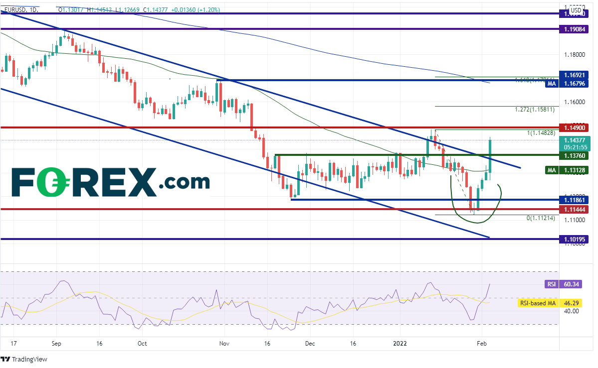 欧元/美元2021年5月以来一直交投于一个下降通道,1月12日一度站上此通道,摸至1.1482高点,但第二天即回落至通道内。该货币对继续下跌,于1月28日形成早晨之星形态,最低触及1.1121。所谓早晨之星形态,是由3根K线组成的反转形态,第一根K线是长阴线、第二根K线是锤子形态或十字星,第三根K线为长阳线。请注意,欧元/美元从未考验过通道的下轨趋势线,上冲后一骑绝尘。