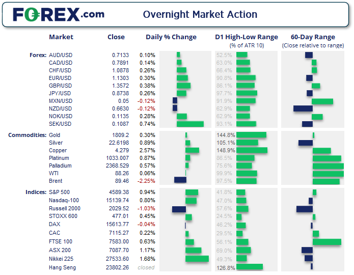 其它货币方面,英镑和欧元是最强主要货币,而纽元和美元为最弱主要货币。欧元/美元在创下记录的欧元区通胀数据的帮助下,已经收复FOMC会后的所有失地。HCIP CPI上涨5.1%,高于5.0%的前值,也远高于4.4%的预测值。欧元/美元摸至6天高点并收上1.13,现测试趋势阻力。美元/日元连续第四天下跌,至50天指数移动均线上方。RSI (2)逼近超卖区域。