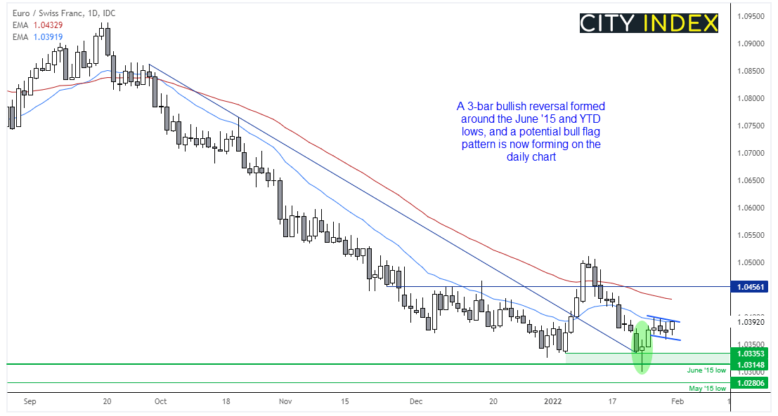 欧元/瑞郎自2021年3月见顶以来一直处于强劲下行趋势当中。但价格走势说明货币对正在试图扭转看跌,或至少展开一轮反趋势反弹。