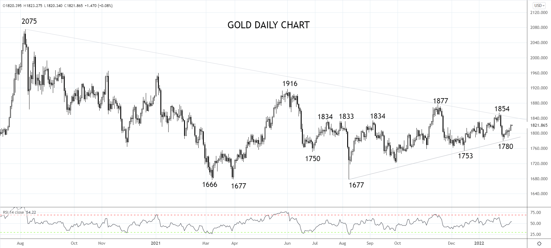 技术面看,过去半年困扰黄金的楔形正在收缩,警示突破在即。如果金价得以站上阻力位1845/55并持续上涨,后市或上攻1950。