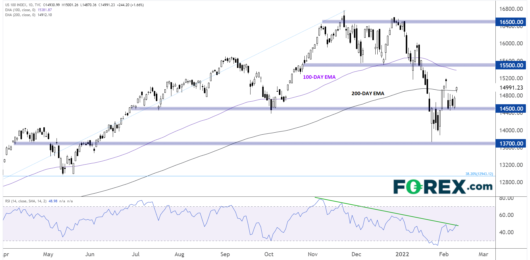 总之,纳斯达克100指数当天涨逾1.5%,收复了200天指数移动均线并测试15,000区域。展望后市,大约每1000点就有需要重点关注的前支撑和前阻力: