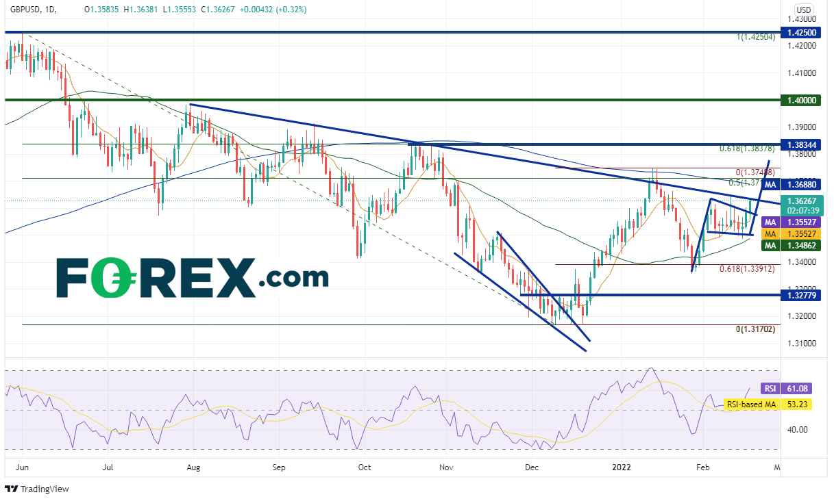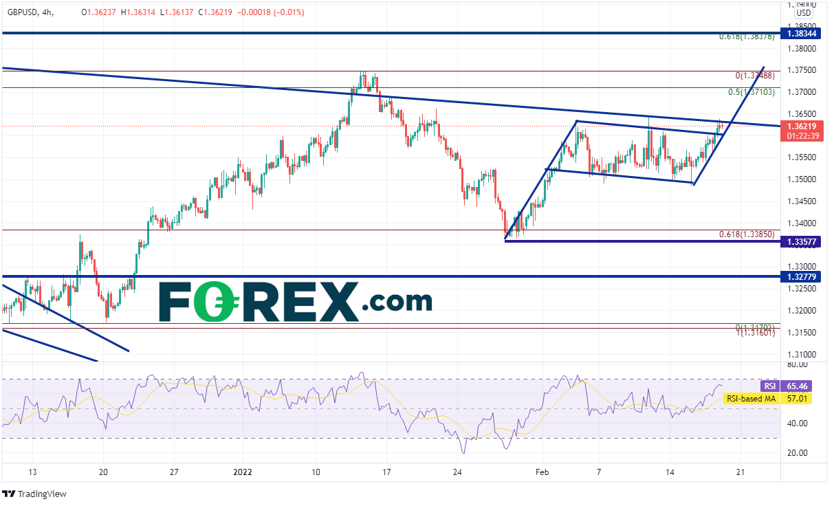 英镑/美元自2021年6月1日创下近期高点1.4250之后不断下跌, 形成下降楔形并在12月9日构筑1.3170底部。英镑/美元打破了该楔形并收复楔形区间失地的一半,回到1.3748。该货币对还虚假上破2021年7月30日以来的下降趋势线和200天均线1.3710附近,之后回撤至2021年12月9日低点到2022年1月13日高点行情的61.8%回档位1.3391附近,此后盘整并形成旗形形态。英镑/美元周四站上旗形,目前尝试收复2021年7月30日以来的趋势线。