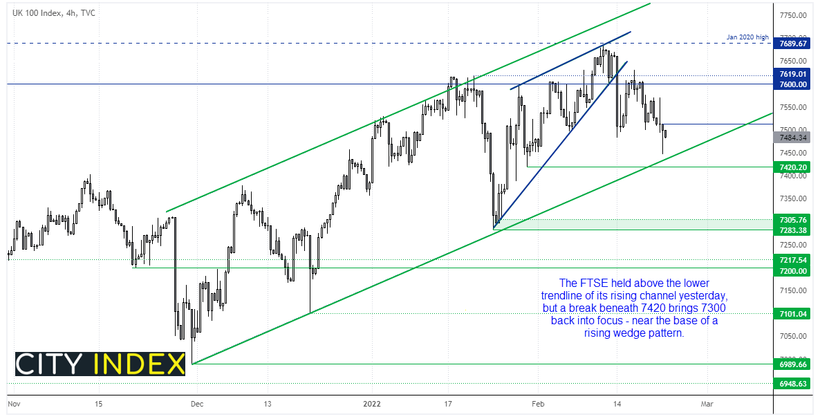 由于富时指数受最近全球股市抛售影响最小,因此,若投资者情绪奇迹般好转,富时或表现亮眼。4小时图可以看到,富时仍处于上升通道内,并已回落探向趋势线下部。但若多头无法夺回控制权,股指或下破7420并发出新一轮推低信号,届时我们将锁定7300附近低点目标,即上升楔形底部。