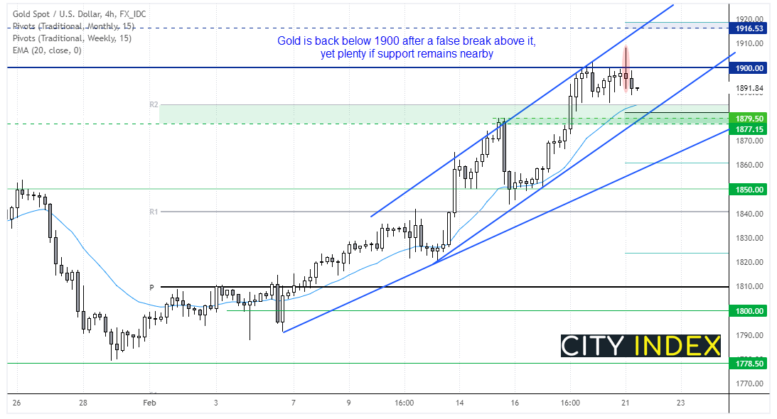 金价于时段较早攻入2021年6月以来最高水平。但风险偏好飙升导致金价回吐涨幅,现探入1890附近。4小时图构筑一条看跌pinbar,看涨趋势可能会反转。