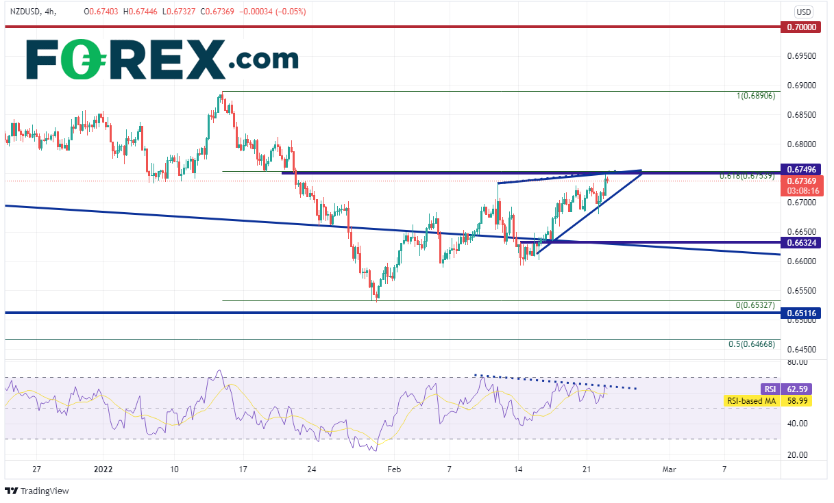 纽元/美元2021年年初以来一直交投于长达一年的下降通道内,今年1月底下破该通道的下轨趋势线,在0.6529创下短线低点后回到通道内,目前测试水平阻力位0.6749和50天均线0.6727附近。请注意,价格突破通道一端失败后常常回过头测试通道的另一端。