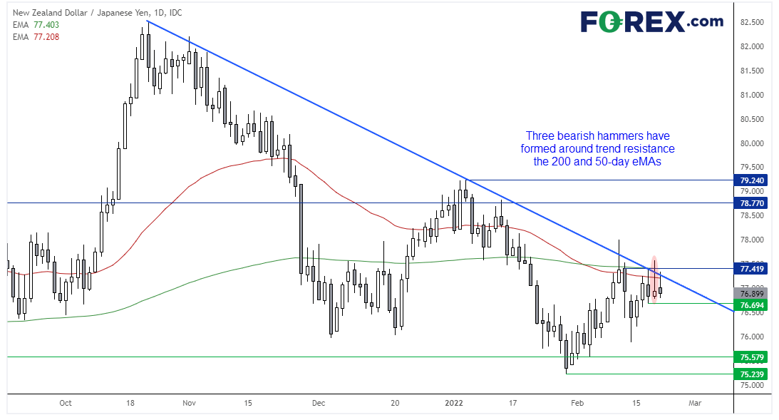 我们在密切追踪的另一日元货币对是纽元/日元。该货币对日图在趋势线阻力位、200天指数移动均线和50天指数移动均线附近形成了三根看跌锤子K线,下破76.94的话确认形态成立,下档重点价位分别在76.0和75.58。