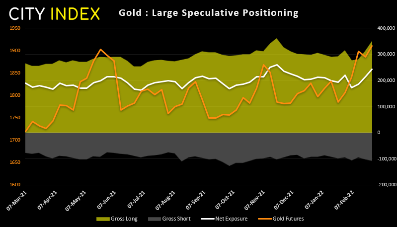 金价上周涨幅逾5%。虽然在俄罗斯入侵乌克兰的动荡背景之下,黄金价格又回吐涨幅,但今天的跳空高开表明黄金仍有买需。大型投机商和管理基金的净多头头寸均升至14周高点,不过前者多空仓都有上升而后者仅看到总多头敞口增加。很难判断在金价自16个月高点回落后,会有多少多头出场,但这确实表明,如果多仓未强制平仓,可能会面临其他市场追加保证金。
