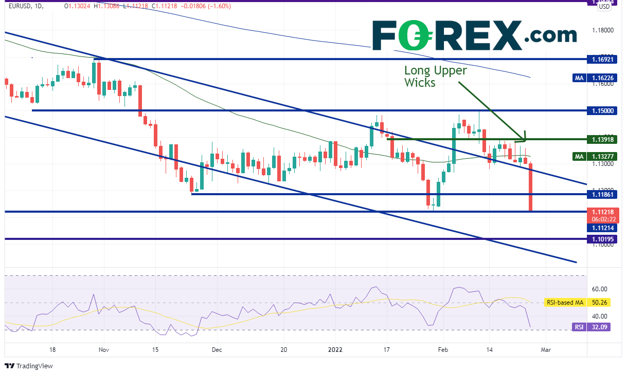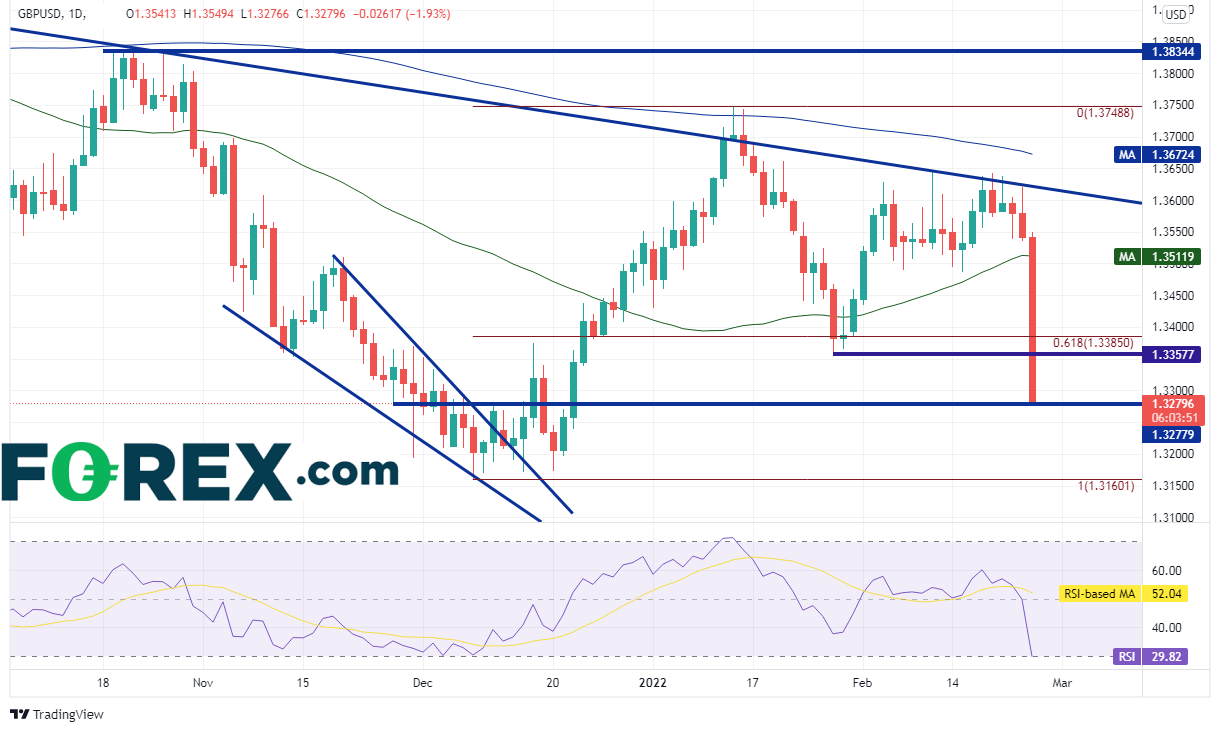 随着俄罗斯势如破竹侵入乌克兰,因为无数投资者相信美国政府在任何情况下都会兜底而被视为避险货币的美元(其它避险资产有日元和黄金)上涨,推动许多对手货币下跌。接下来我们观察今天波动最大的几个货币对及其可能休整甚或反转的技术点位。