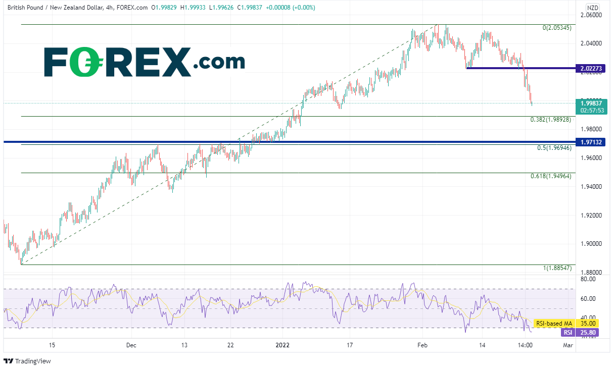 英镑/纽元4小时图在2月3日探入11月8日低点到近期高点行情的38.2%回档位,即1.9893构成的支撑位。下档支撑位是1.9689 - 1.9713区间,由200天均线、前述行情的50%回档位和水平支撑位组成,然后是前述行情的61.8%回档位1.9496。但请注意,RSI目前处于超卖区域,暗示英镑/纽元可能跌势过深、跌速过快,或准备反弹。上方第一阻力在2月22日高点2.0227以及2月3日高点2.0535。