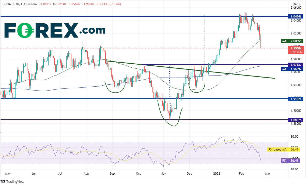 纽元走强导致英镑/纽元承压下挫。该货币对在2021年秋季构筑头肩底形态并在当年的12月17日站上颈线,即1.9600附近。该形态的目标为颈线突破位加上颈线到头部的高度,本例中为2.0475附近。在英国央行立场强硬的预期作用下,英镑/纽元反弹并于1月28日到达前述目标,此后于2月3日创下2.0535高点。自那以后,该货币对不断走低,短短两天里就跌逾335点子。