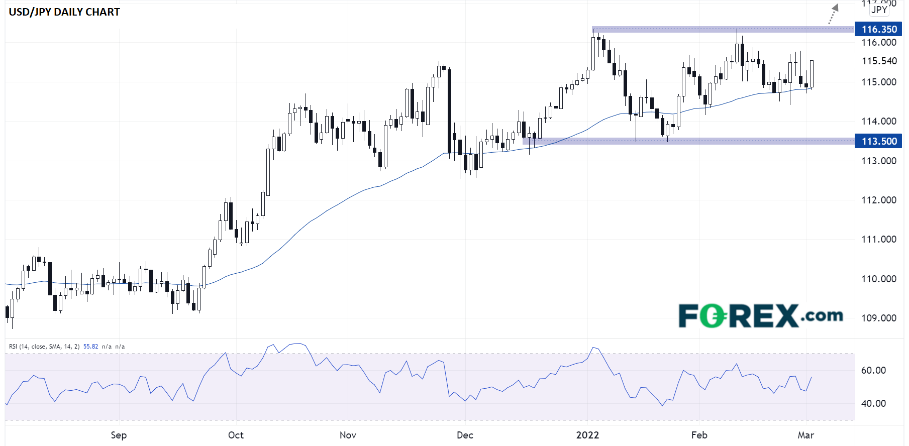 鲍威尔上述有关美联储本月如期加息的保证帮助美元兑日元和瑞郎等避险货币上涨,我们重点关注美元/日元。该货币对沿着50天指数移动均线上涨,但此文发稿时没有脱离113.50-116.35的大区间。