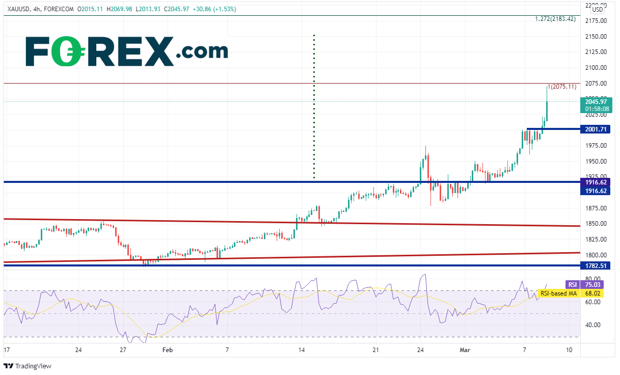 自从2020年8月创下历史高点以来,黄金(现货黄金/美元)一直交投于对称三角形内。该贵金属在2021年夏季于1678.88附近构筑双底后开始走高,2月11日站上三角形上轨趋势线,那是美国宣布俄罗斯可能随时侵入乌克兰的前一天。金价在2月底击穿双底颈线,随后一飞冲天。双底形态的目标在2153附近,但首先必须清除历史高点2075的障碍。请注意,日图RSI超买,表明金价可能准备回撤。