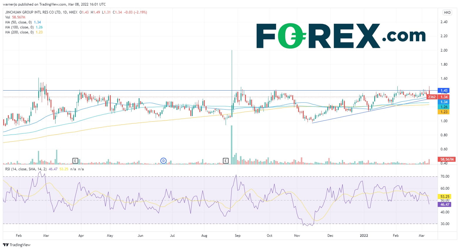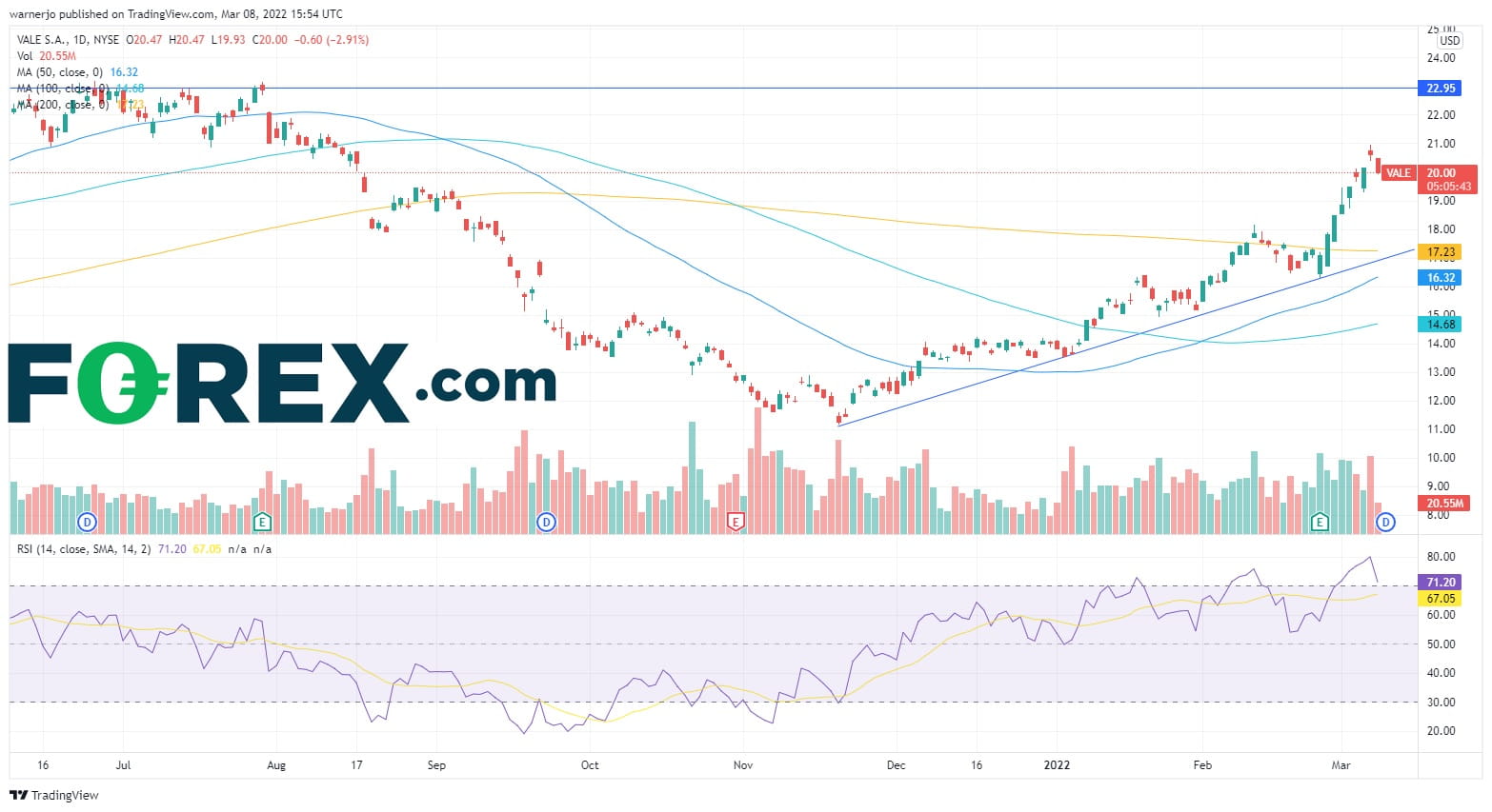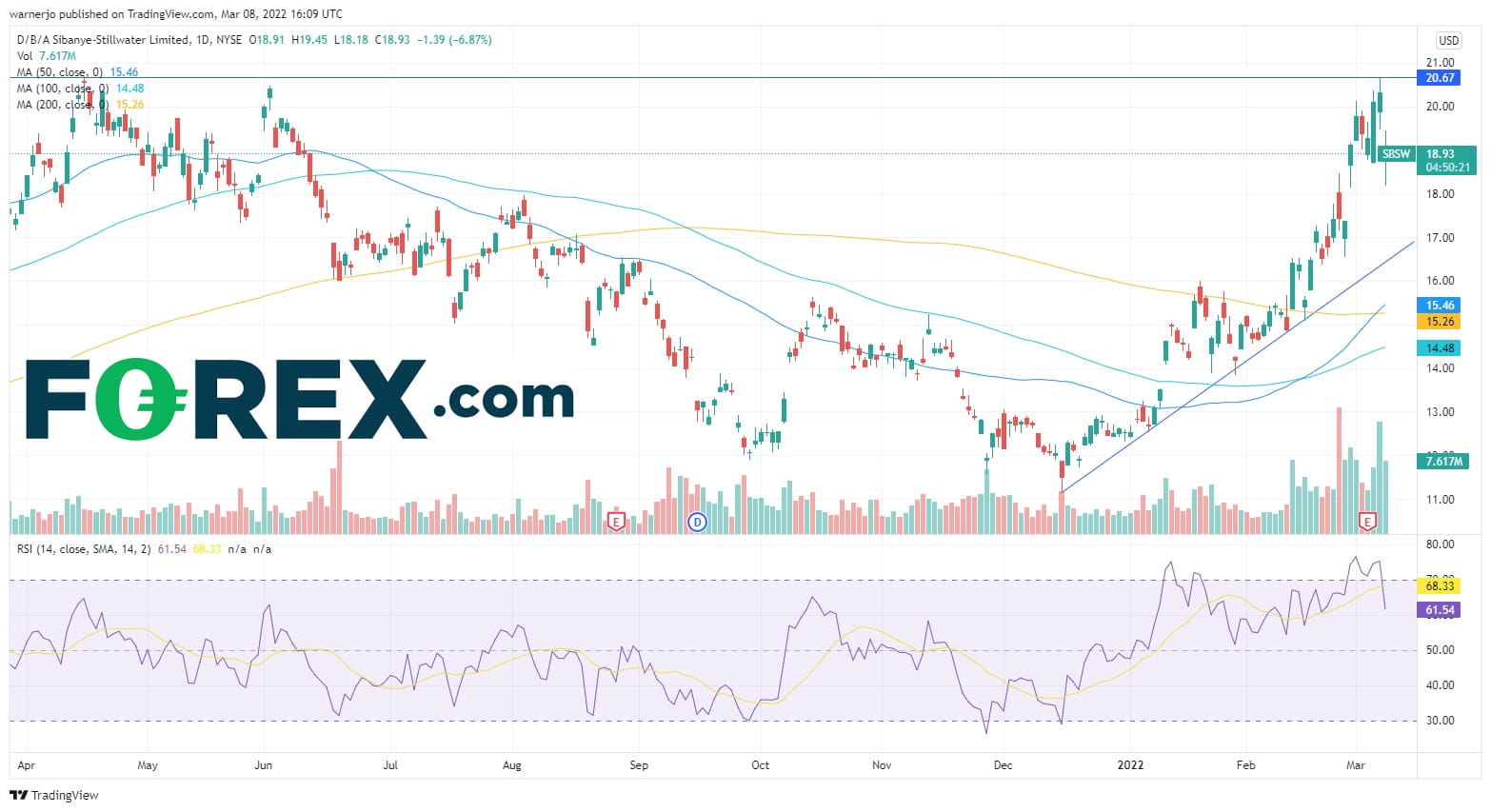 该公司股价自12月创下14个月低点以来涨逾62%,俄乌冲突爆发后更是加速上涨。然而,在昨天创下20.64高点(亦是去年4月的历史高点)之后丧失了上涨动能。股价需要站上20.64历史高点才有上涨空间,这点也得到了看涨RSI和放大的成交量的验证,而50天均线最近上穿200天均线是又一看涨信号。然而,在维持当前涨势的前提下,股价有跌至17的空间。价格和RSI背离的事实暗示价格可能暂时朝趋势线回撤,如果下破,可能打断当前上涨步伐,打开下探50天均线和100天均线的空间,目标15附近。