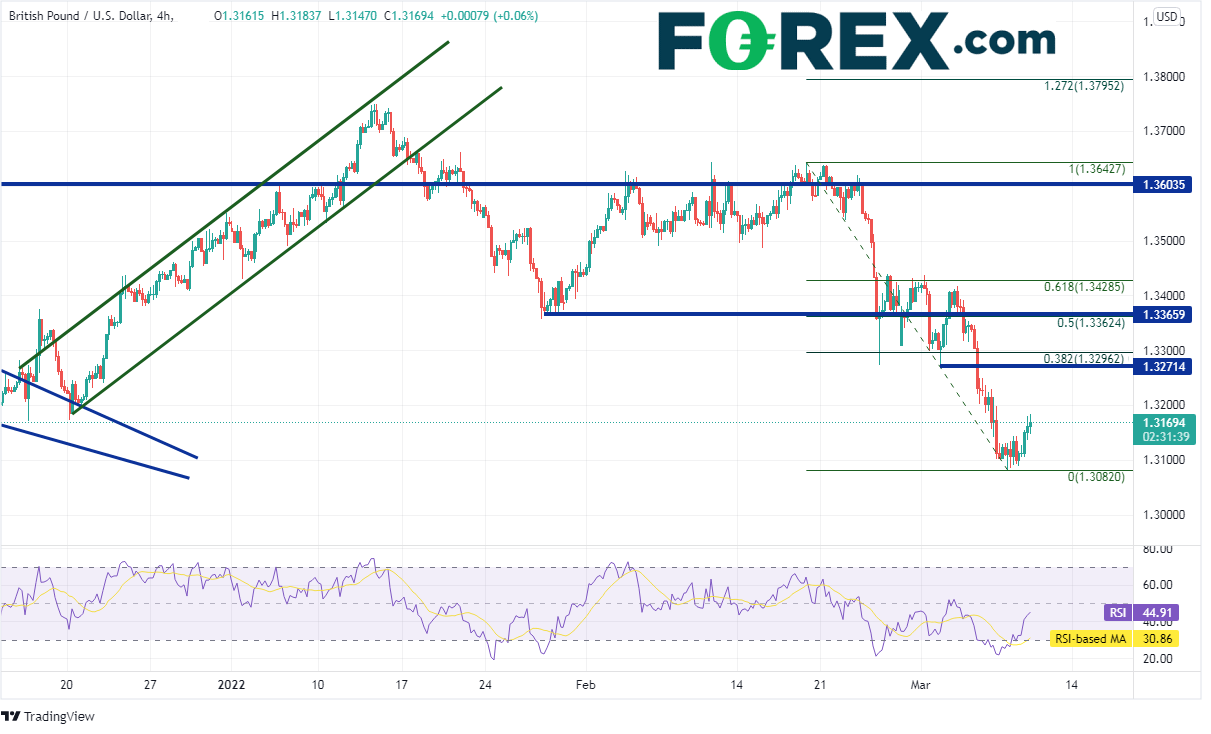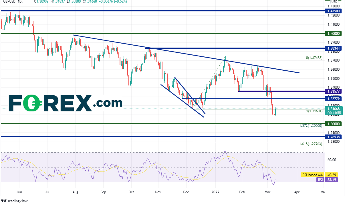 4小时图上的第一个阻力位在2月24日兼3月2日低点1.3271附近,然后是2月18日高点到3月8日低点行情的38.2%回档位1.3296附近,接着是水平阻力位兼前述行情的50%回档位1.3362。第一支撑位在3月8日低点1.3082,然后是1.3000的心理整数支撑位,那也是2021年12月9日低点到2022年1月13日高点行情的127.2%扩展位。第三个支撑位是2020年11月2日低点1.2854(请看日图)。