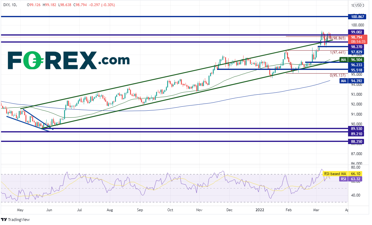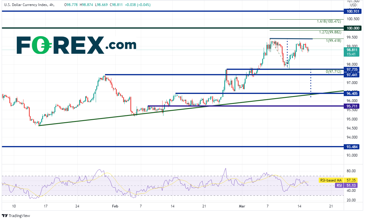美元指数4小时图可能正在构筑双顶形态,如果突破97.73支撑位,或确认前述形态成立并剑指96.21的下档目标。但要到达此目标,首先必须击穿97.44支撑位。该位下方是由2月14日高点和1月14日以来上升趋势线组成的支撑位,即96.40附近。请注意,日图上50天均线也在这些价位附近,落在96.50。第一个阻力位在3月7日高点99.42,然后是由3月7日高点到3月10日低点行情的127.2%扩展位99.82,以及100.00的整数心理关口和100.47附近的161.8%扩展位。