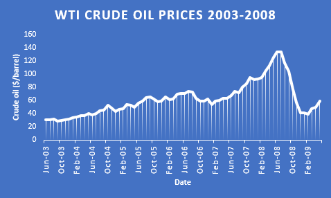 比如,在2003年到2008年期间,OPEC的剩余产能只有200万桶/天左右 – 在全球供应中的占比为3%。对供应的关切以及(利比亚等)OPEC成员国减产的威胁导致油价自2003年9月的25美元/桶飚升至2008年7月的147.02美元/桶。