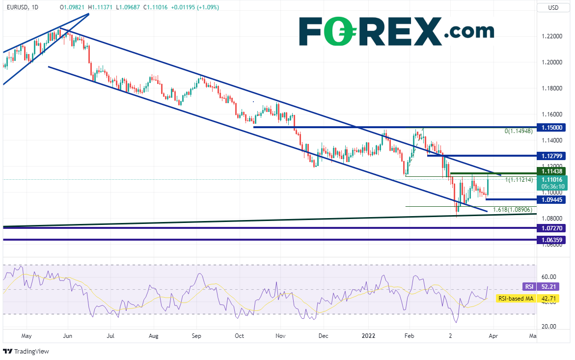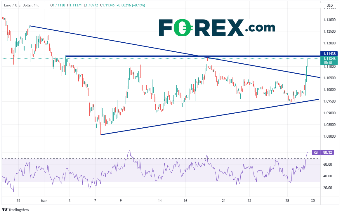 欧元构成美元指数的57.6%,可以说欧元/美元和美元指数反向波动。欧元/美元小时图站上2月25日以来的下降趋势线,目前正试图攻克水平阻力位、3月2日以来区间的高点1.1143。