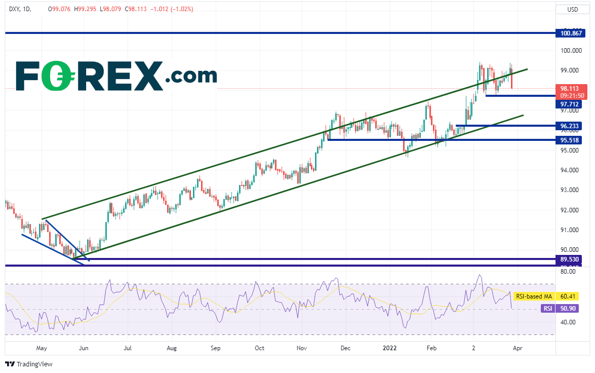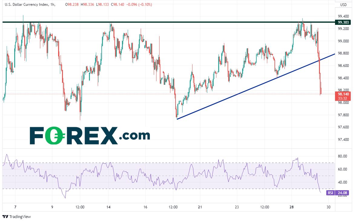 受上述向好消息的影响,美元指数骤然回撤。美元指数小时图连日来一直试图站上99.30,但始终未能收于其上。在今天抛盘的打击下,美元指数大举回撤,下破3月17日以来的上斜趋势线。
