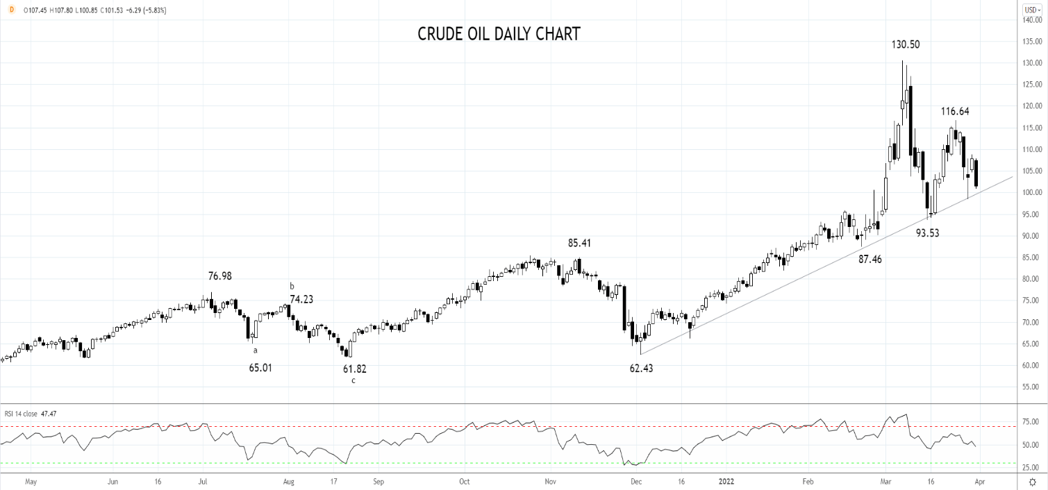 如果油价确实持续下破下图所示的100附近的趋势支撑,后市或回踩3月中旬创下的93.53低点。