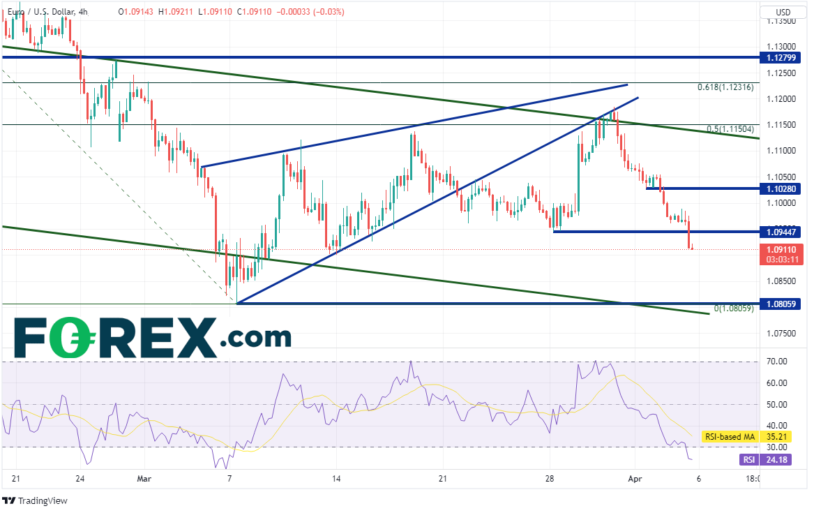 欧元/美元构成美元指数约57%的权重,通常与美元指数反向交投。欧元/美元4小时图下破了上升楔形,回踩了楔形的下轨趋势线1.1184后下跌并在今天攻克3月28日以来低点1.0945附近。下档支撑位在3月7日低点1.0806。但请注意,RSI超卖,表明价格可能反转。阻力在1.0945下破位和水平阻力位1.1028。