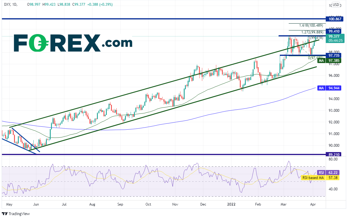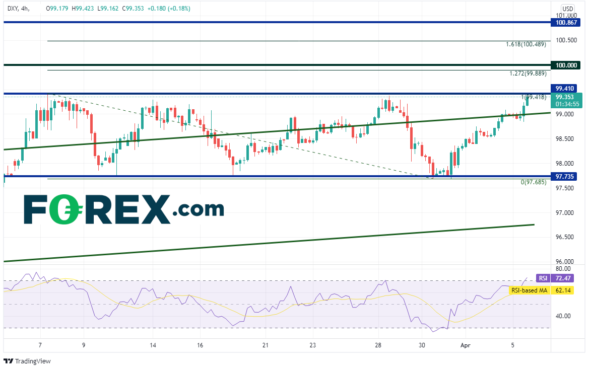 这些强硬评论足以推高美元。美元指数2021年5月以来一直处于一个上斜通道内,于3月4日站上通道顶部,在3月5日创下99.41高点。自那以后,美元指数围绕着通道上轨趋势线震荡,交投于97.68-99.41区间。