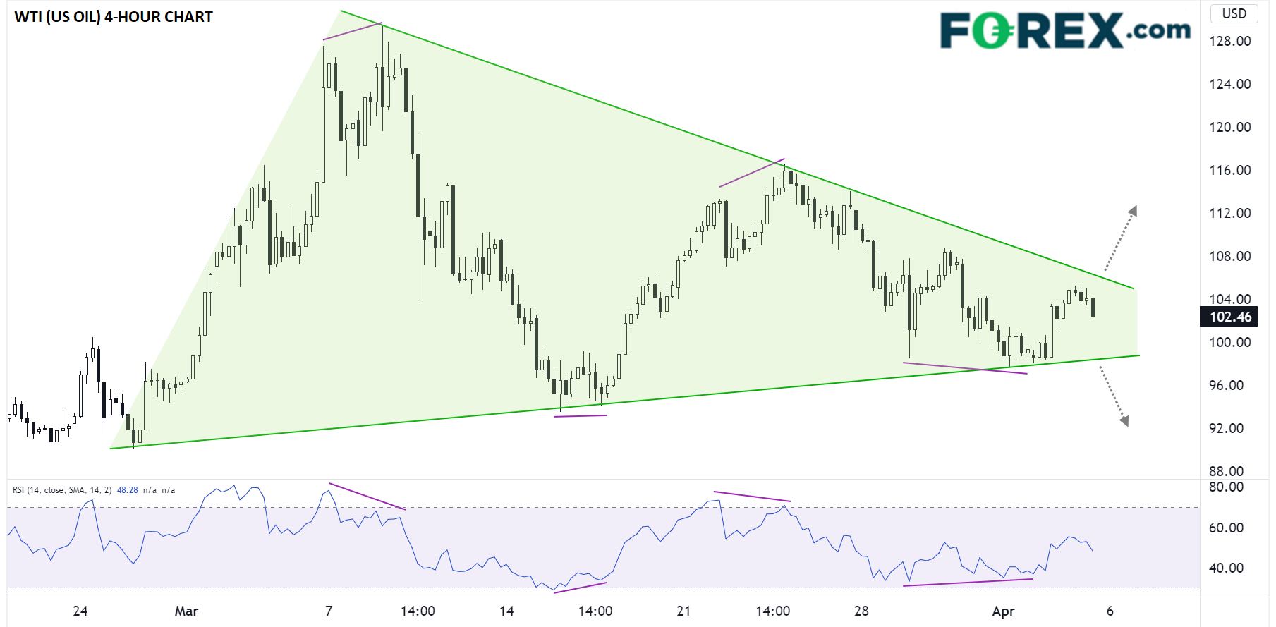 值得注意的是,上述走势的波幅一浪小于一浪,在图表上形成系列下降的高点和上抬的低点。如果转化成传统技术面分析语言,那就是油价在3月明确构筑“对称三角形形态”。提醒不熟悉的读者,对于该形态的一个常见比喻是:从两端向内压迫弹簧后在内部积蓄能量,一旦其中一端压力释放,弹簧(西得州油价)就有可能朝着释放的方向急速波动。