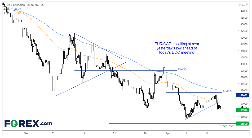 我们在3月时强调欧元/加元形成了看跌三角形,目标在1.3550。该货币对已到第一目标1.3800附近,但尚未到达三角形目标。欧元/加元仍处于强下跌趋势中,现于支撑位处徘徊,等待今天加拿大央行的决议。如果加拿大央行强硬加息且宣布量化紧缩,欧元/加元可能下破。当然,如果加拿大央行的决议不及预期,可能推动欧元/加元自关键支撑反弹。那样的话我们取消短线看跌观点并持币观望。