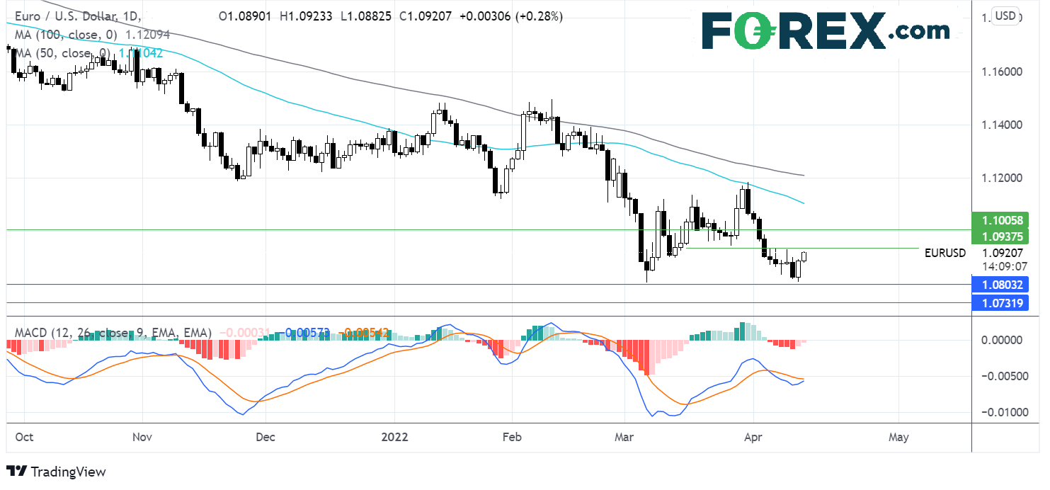 如果站上1.0950,多头或加速上攻1.10心理大关,然后上看50期简单移动均线所在的1.11。