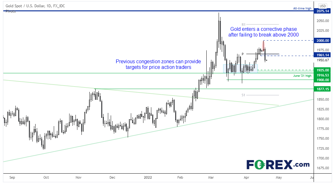 我们在昨天的视频中指出了黄金下跌的可能性,而金价也确实跌至6天低点。周一形成了看跌pinbar,无力守住早盘尝试站上2000时斩获的涨幅。我们相信金价短线前景,而基金经理上周增持头寸。所以,金价的下跌可能只是回调。我们目前认为,金价可能受制于月图枢轴点1965下方并下探我们的第一目标1925附近,那是前密集区域的中轨所在。
